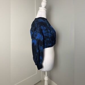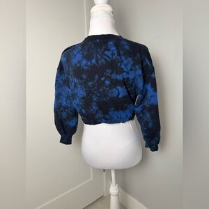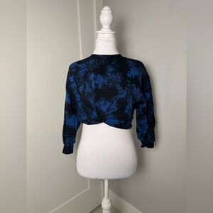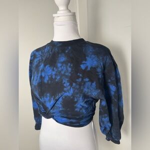 Tags: tie dye sweatshirt, cropped sweatshirt, blue black tie dye, long sleeve crop top, casual lounge top, trendy sweatshirt, streetwear style, cozy pullover, bold print sweatshirt, statement loungewear, tie dye crop sweater, comfy casual top, workout sweatshirt, festival style top, relaxed fit sweatshirt