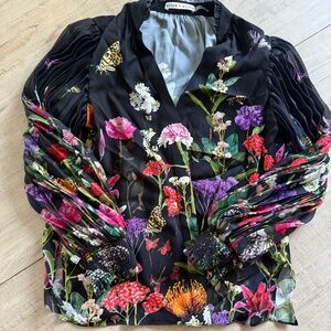 Never worn. Finished with a bright floral print, Alice + Olivia's Ilan blouse showcases long pleated sleeves, a V-neck, and pull-over style.