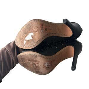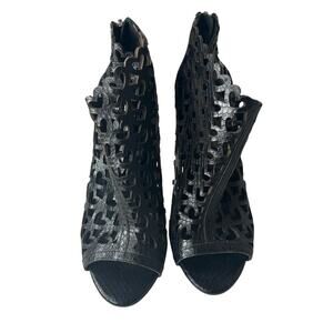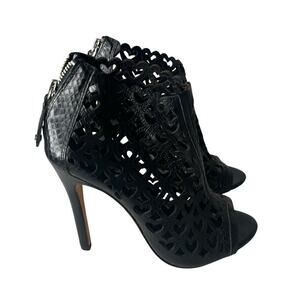 Alice + Olivia Gerri Heart Laser Cut Leather Booties in Black. Size 36 (US 6). Features peep toe, stiletto heel, heart laser cut, leather upper, leather lining and sole, and back zipper closure. Excellent pre-owned condition.