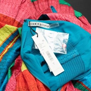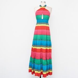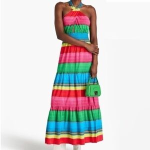 Alice + Olivia Lyndon Maxi Dress combines vibrant stripes in fun, summery colors with a timeless silhouette. Designed with a halter neck and crossover front, this breathable cotton-blend dress features tiered layers, shirred trims, and a flattering fit. The bright hues make it perfect for sunny days, beach weddings, or summer soirées. The back zip and button neck closure ensure easy wear, while the fully lined, mid-weight fabric offers a very slight stretch for comfort. Made from 97% cotton and 3% elastane.