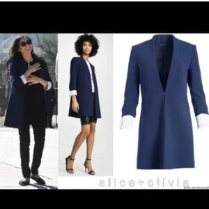 Add a dose of modern polish to any look with this Alice + Olivia blazer, a collarless topper defined by rolled cuffs with a striped interior. Designed for a contemporary fit, Collarless, shoulder pads, long sleeves, Roll cuffs with pinstripe lining, front hook-and-eye closure, Shaping seams, two interior zip pockets, two front pockets, Back vent.