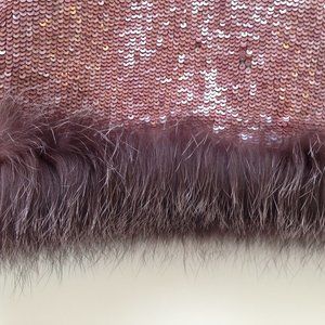 This sleeveless style from Alice & Olivia is a pretty shade of frosty chocolate milkshake! It is made of silk, embroidered all over with sequins, with a back exposed zipper, and fully lined. It has that mod "Last Night in Soho", 1960s inspired look with its A-line style and genuine fur (feels like fox) hem. It comes with a packet of replacement sequins.