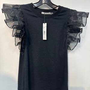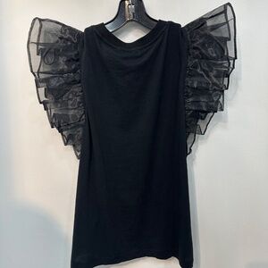 Black cotton tank, sheer oversized ruffle sleeve, crew neck