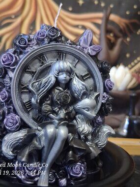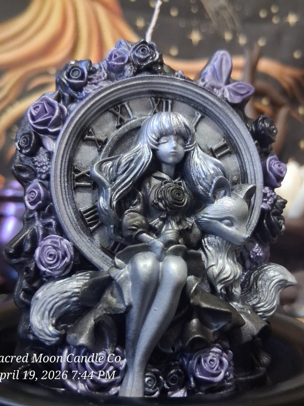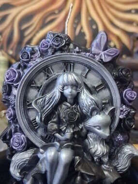 A hauntingly beautiful gothic creation from Sacred Moon Candle Co. Alice sits before an ornate clock face, cradling a rose with a mystical fox at her side. Purple roses and a lavender bow frame the scene in twilight purple and metallic silver.