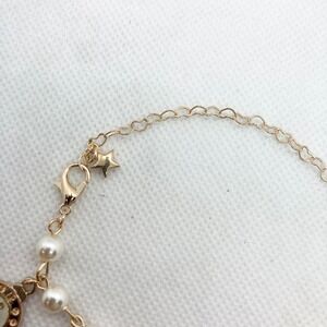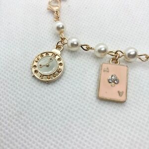 Dainty Alice in Wonderland themed charm bracelet. Features golden fastenings with 5 charms and 11 faux pearls. Charms include a carriage, rabbit, Alice, the ace of spades with three clear rhinestones, and a clock. The end of the bracelet are heart shaped chains with a star at the very end. Lobster clasp closure. Hardware is made of a gold tone zinc alloy, pearls are plastic beads.