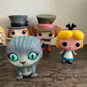 Funko figures from Alice in Wonderland. Includes Alice x2, Mad Hatter x2, and Cheshire Cat. No boxes