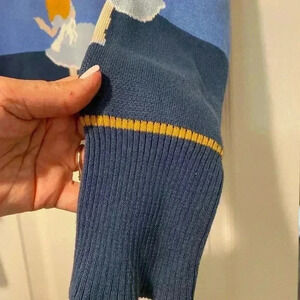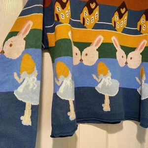 This is a gently used knitted sweater of Alice in Wonderland. It is absolutely adorable. It is in great condition. I am not aware of any stains. This is a ‘one size’ sweater so I have provided measurements for you to confirm it’ll fit you as you’d like. With it being 21 inches pit to pit in the front marks it at a large, but I do think it would be fitted. For a little bit looser wear a medium would provide for that. please let me know if you have any questions and consider looking at my closet for possible bundling.