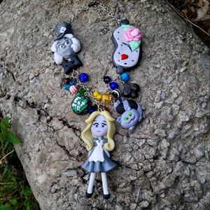 Old Movie Alice in Wonderland and characters necklace. Colors - Black, grey and white. Perfect for children or adults but Warning hazard choking please don't put in mouth. Size about 18.5" and will fit under to about 14"