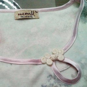 Couldn't believe when I found this! It's a sample, possibly never worn (no real wear on it), from One World in a design much more elaborate than their normal t's & tops. Their cotton knit tops often have interesting prints like this with floral or other depictions, but I have yet to find even one with the fine ribbon binding at scoop neckline enhanced by a little loop cutout with a non-functional wound-ribbon frog closure. The text on this one includes phrasing from "Alice in Wonderland" & the huge romantically-shaded roses are SO PRETTY! Print extends on back of shirt as well. Measures pit-to-pit without stretching 17". SFPF home.