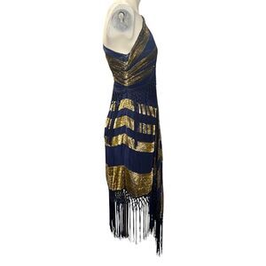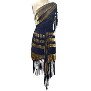 Akima Blue Gold Fringe One Shoulder Party Dress