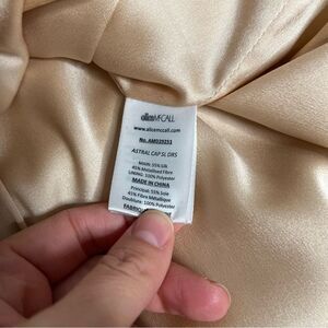 Perfect party dress by Alice McCall. Style astral plane cap sleeve mini dress in gold. Wrap style. Plunging neckline. Puffed sleeves. Sleeves tie just above elbows. Invisible back zipper. Please note that due to delicate nature of fabric there are some tiny thread pulls as shown but no holes and very difficult to notice while wearing. Lying flat armpit to armpit approx 20” across and top of shoulder to bottom hem approx 34.5”. All measurements are approximate