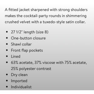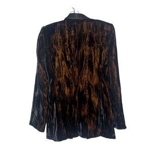 GORGEOUS crushed velvet tuxedo blazer with a satin shawl collar. The color is black with an underlying deep copper sheen when it catches the light - super special! (I tried to show how cool the color is by showing the blazer color change with different angles in the photos)