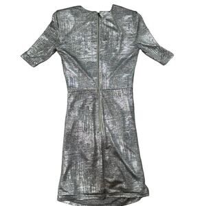 SEO Keywords: silver metallic mini dress, Alice + Olivia holiday dress, ruched bodycon party dress, NYE cocktail outfit, winter wedding guest dress, metallic silver bodycon, Delora dress size 0