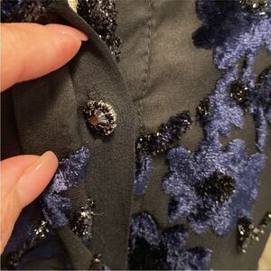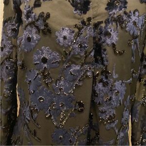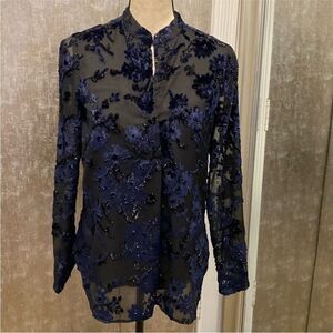 Elegant sheer top with intricate floral embroidery. Features a stylish black and blue design, perfect for any occasion. New, no tags