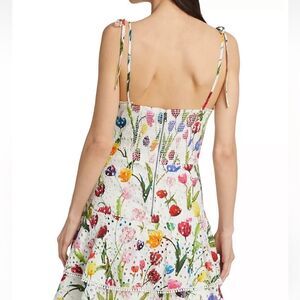 Alice + Olivia's Rosette minidress is crafted of eyelet cotton. This floral style features a sweetheart bodice, adjustable tie straps, and a tiered flounce hem.