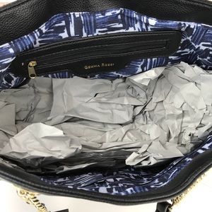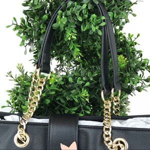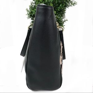 The Alice tote bag by Gemma Rossi is black with mauve & cream flowers with gold studs. Gold chain flat strap shoulder straps with a 9.5” drop. Inside blue patterned fabric, zip pocket on back wall & 2 slip pockets. Synthetic material that looks like leather. Light weight bag.
