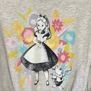 Add snug comfort to your seasonal wardrobe with this Women's Disney Alice and Wonderland Graphic Sweatshirt - Heather Gray. This soft, cozy and comfortable women's sweatshirt with a front Alice in Wonderland print lends a fun touch to your cool-weather wear. It features a scoop neck for extra warmth and a pullover style for easy wear. The ribbed design on the hem and cuffs ensures a snug fit. You can pair it with jeans, joggers or jeans to create a range of cool-weather styles.