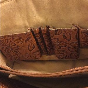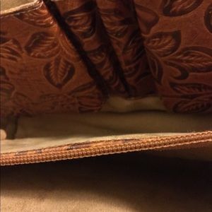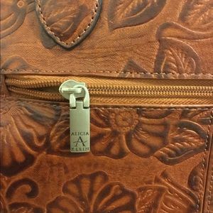 The luxury look of Alicia Klein Brown Floral Embossed Leather Handbag with a microfiber inside Lining. Handbag has Embossed divided inside sections. Outside zipper pocket, inside middle zipper pocket, straps are padded on shoulder area.