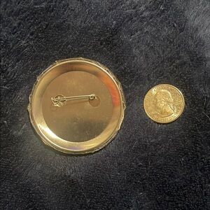 Round button pin with aliens. Quarter for size comparison.