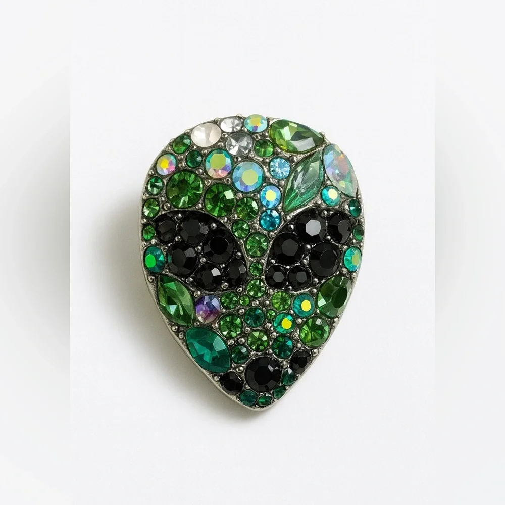 Sparkling brooch with green, black, and blue rhinestones forming an alien face. Perfect for adding a unique touch to any outfit.