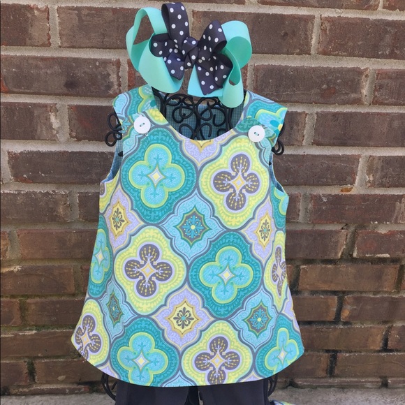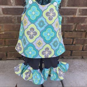 This is a lined align top, Ruffle rumba pants, and matching bow. Buttons can be adjusted for length, perfect with initials. Great for summer or winter.