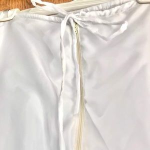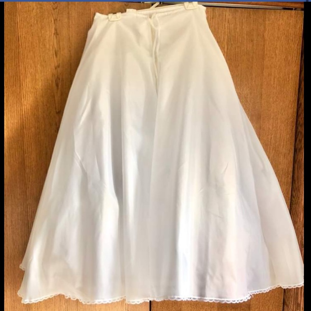 32 inch adjustable waist. Bought it for my wedding and had a tie and a zipper put in to keep it up better then I decided not to wear it, due to it being a very warm day. It's very comfortable and adds a nice A-line to any dress.