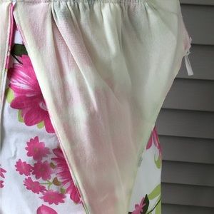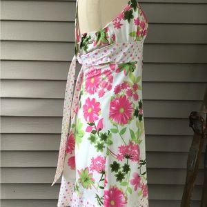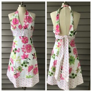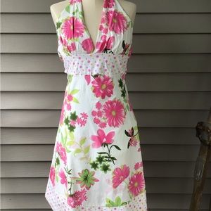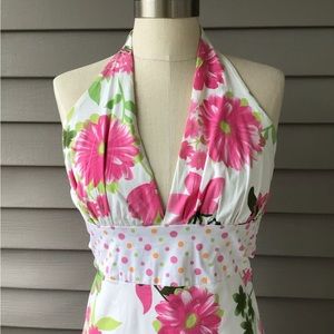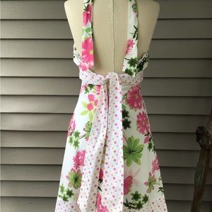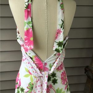 A-line halter top party dress super fun and cute, hot pink, lime green and orange features polkadots with flowers, zippered back lined and the tie is attached. This is one of my all-time favorites. It’s an excellent condition I just don’t have a use for it anymore. 96% cotton a small amount of spandex dry clean only made in the USA. It was purchased at a boutique. It does not have a designer attached to it. It is a size small. The length is 25 inches from the waist