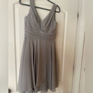 A chic and elegant style, this short bridesmaid dress offers curve-cradling style with ruching details. It features a ruched V-neck bodice with shoulder straps that attach in back to beautifully frame the mirrored V-back. A flowing layered chiffon gathered skirt has just the right amount of sass