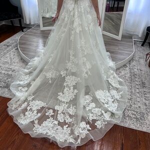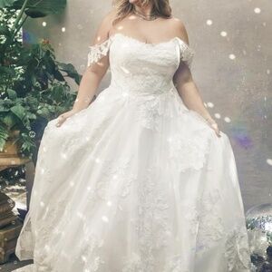 This dress was only worn when tried on. It is brand new! This is an ivory off-the-shoulder lace dress with a gorgeous full skirt silhouette. The support is SO COMFORTABLE and the material is light and luxurious feeling. There are two detached lace sleeves that can be draped.