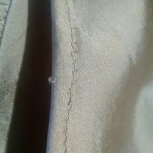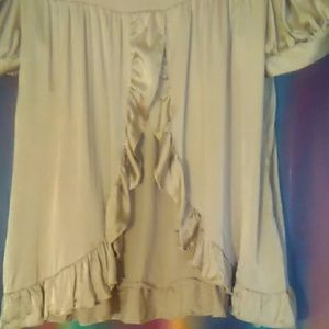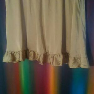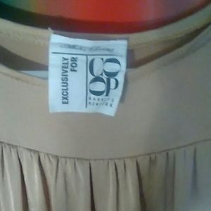 Gold short sleeve flowy ruffled open back blouse. Super cute & comfortable;100% Silk; Small stain at front (photo 4). Other wise great condition. Small pull at back collar ( photo 8)