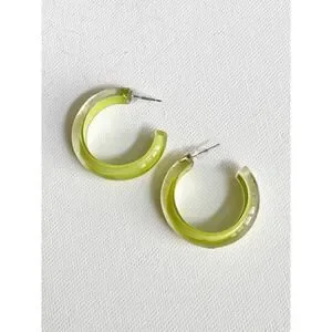 Clear lucite small hoops with hand painted lime enamel. 14K gold plated posts and backs for pierced ears. Approx. 1" long.