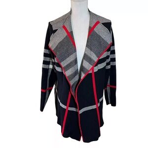 Alison Sheri Relaxed Open Striped Plaid Knit Cardigan Sweater Black Red White