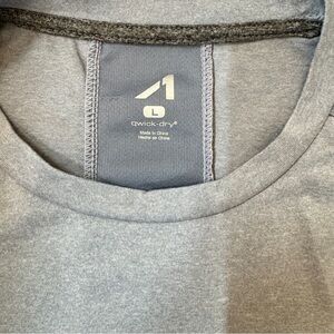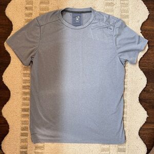 Lightweight qwick dry t-shirt in grayish blue with a soft athletic feel. Men’s size large. Simple crew neck style perfect for workouts, layering, or everyday activewear.