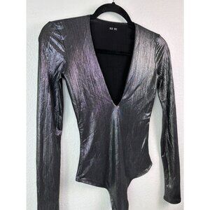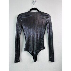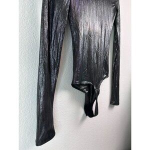 Alix NYC brand women's size XS silver metallic Irving Lamé Bodysuit. New without tags, no sign of wear. Long sleeve lightweight thong bottom bodysuit. Has a deep plunge neckline. Metallic material shines in all light.