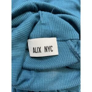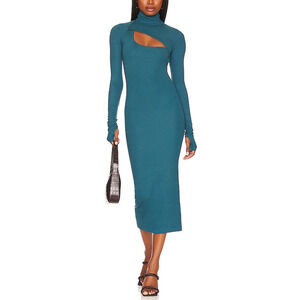 Alix Nyc 'Clarkson' Blue Midi Dress Size XS: unlined, pull-on styling, turtleneck styling, front cut-out detail, ribbed jersey fabric with thumbhole design.