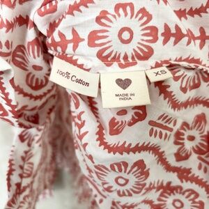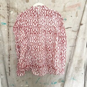 Red floral block print pattern, full button down style with long sleeves and a ruffled collar