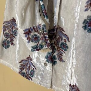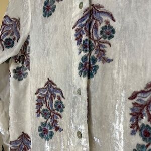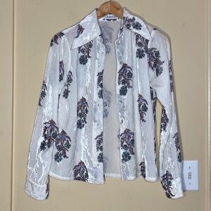 Elegant white blouse with floral pattern. Features long sleeves and button-up front. Perfect for casual or formal wear.