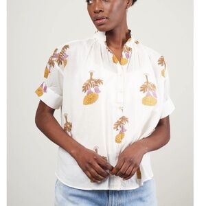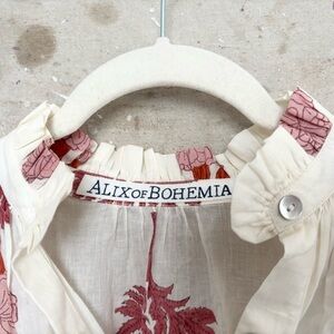 Individually cut by hand, our floral print shirt has short puffed sleeves, a ruffled collar, and a mother-of-pearl button front. The cotton voile shirt is hand-block printed with columns of pink lilies.
