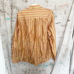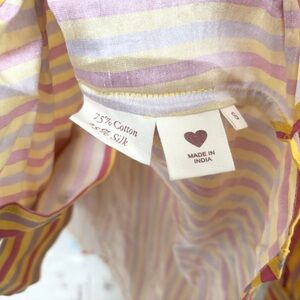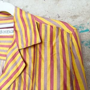 Vibrant striped shirt by Alix of Bohemia. Features yellow, pink, and purple stripes.