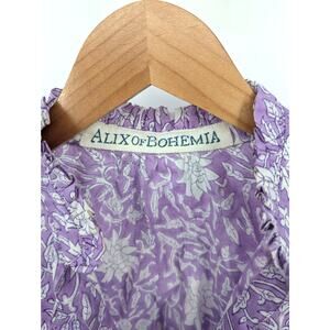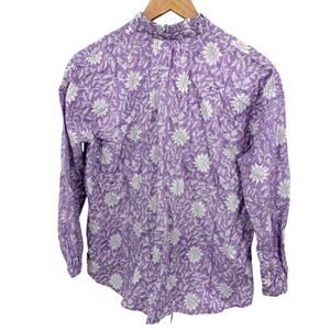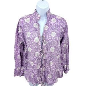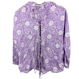 Beautiful and lightweight Alix of Bohemia blouse in a purple and white floral print. Features a tie-front closure, long sleeves with button cuffs, and a relaxed bohemian silhouette. Made in India from 100% cotton for breathable comfort and effortless style. Size XS (see measurements below).
