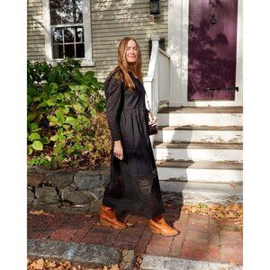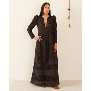 Keywords: Alix of Bohemia dress, Winifred dress, black eyelet maxi dress, bohemian artisan dress, romantic cotton dress, puff sleeve dress, cutwork embroidery, silk blend lining, festival style dress, long sleeve black dress, timeless boho dress, occasionwear, resort evening dress