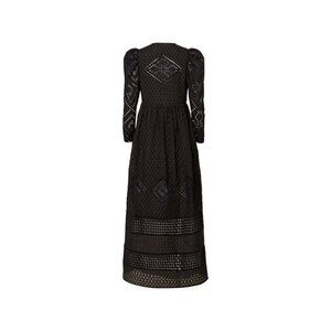 An elegant, bohemian-inspired eyelet dress from Alix of Bohemia, the Winifred dress is crafted in rich black cotton with intricate cutwork embroidery and silk-blend lining. Designed with long sleeves, puffed shoulders, and a deep V neckline, this style carries a timeless, artisanal feel while remaining effortlessly wearable. The full skirt with diamond eyelet details adds movement and artistry, making this a signature piece from the brand’s romantic collections.