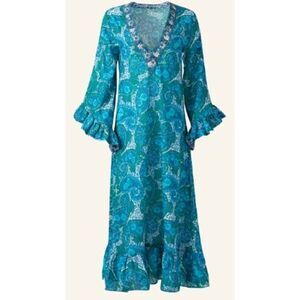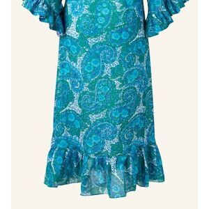 Crafted from block-printed cotton, our paisley print turquoise dress skims the body with an easy fit. With bell sleeves, ruffled at cuffs and hem, the long dress silhouette is perfect for covering up without compromising style.