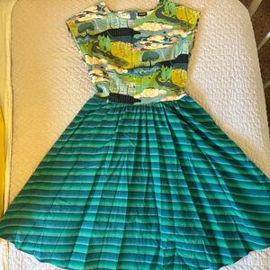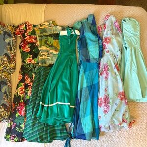 Never been worn and have just been stored for why they’re wrinkled. Some have tags and others don’t. I’m selling the dresses individually but have listed them as a group to reduce listings. They’re mostly large with one XL(the baby blue floral printed Hell Bunny dress). Retrolicious, ModCloth, Hell Bunny, and Emily and Fin.