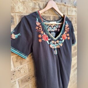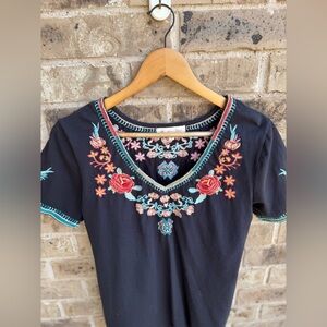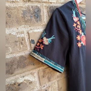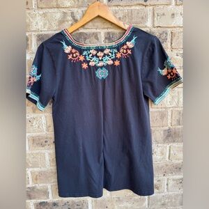 This elegant black top features vibrant floral embroidery, perfect for adding a touch of color to your wardrobe. Ideal for casual outings or special occasions.
