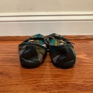 Well made, green teal and blue multicolor fabric top mary janes with leather strap