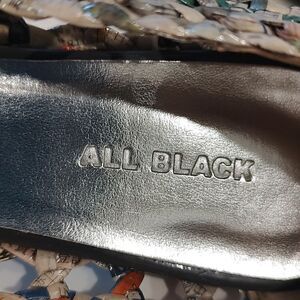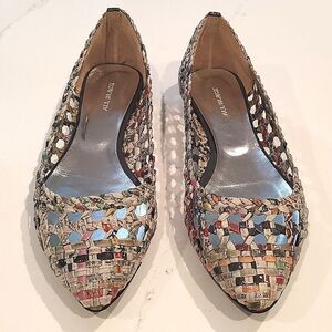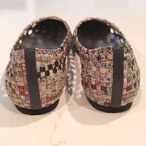 All Black Recycled Newspaper Woven Pointed Toe Ballet Flats designed by Colin Lin. These eco-friendly flats are constructed with mixed color recycled strips of Chinese newsprint that are folded and woven in a lattice pattern and then dipped in plastic for durability, comfort and water protection. Padded insoles, leather soles and a leather strip at the back of the heel. 1/4" heel. Made in Taiwan. Size 38.5, US Size 8