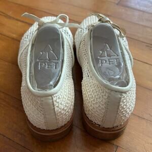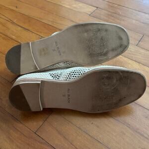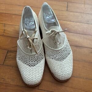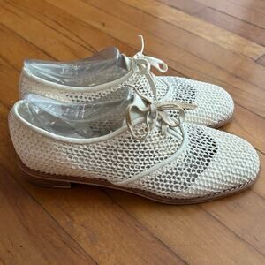 All Black woven oxfords in cream. Lace up. Leather shoe laces. One of the laces has some darker discoloration on the underside. Size 38 or US 7.5.