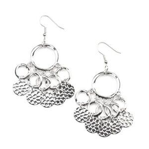 Tapered rows of interlocking hammered silver discs and dainty textured silver hoops cascade from the bottom of an airy silver hoop, creating a chime-like fringe. Earring attaches to a standard fishhook fitting.