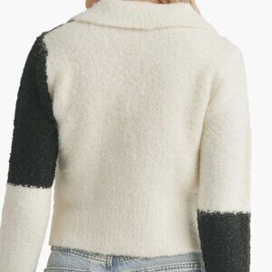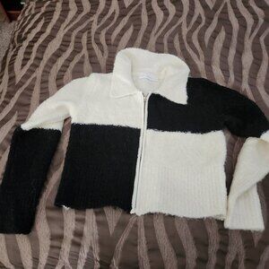 New All In Favor zip up cardigan. Black and off-white color-block design makes it eye-catching and neutral. The sweater has a fuzzy texture which makes it really cozy